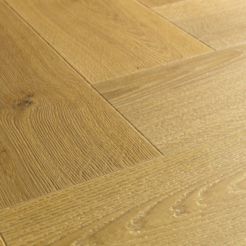 Thiết kế vát cạnh Authentic bevel tạo đường nét rõ ràng cho từng thanh sàn, tăng chiều sâu thị giác và mang lại vẻ đẹp chân thực như sàn gỗ tự nhiên. Kiểu lắp đặt herringbone pattern (xương cá) giúp bề mặt sàn trở nên sinh động, sang trọng nhưng vẫn giữ được sự nhẹ nhàng và tinh tế.