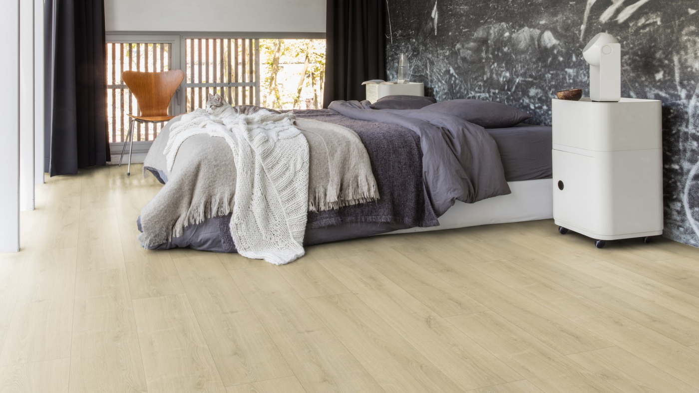Quick-Step ứng dụng công nghệ tiên tiến với hệ thống hèm khóa Uniclic độc quyền và lớp lót cách âm thông minh. Nhờ đó, sàn mang lại cảm giác êm ái khi di chuyển, không phát ra tiếng kêu khó chịu, giúp phòng ngủ luôn yên tĩnh – lý tưởng cho giấc ngủ sâu và không gian thư giãn trọn vẹn.